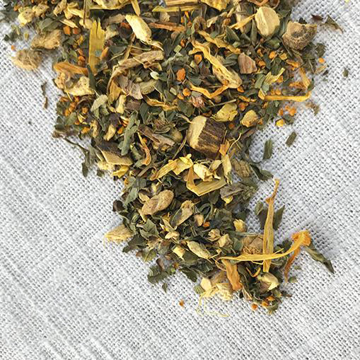 Ginger root, peppermint, turmeric, licorice root, fennel, calendula petals, cardamom oil